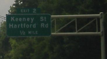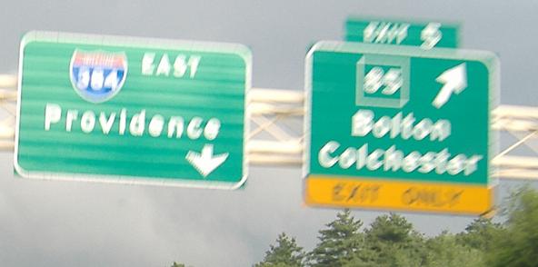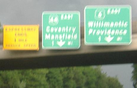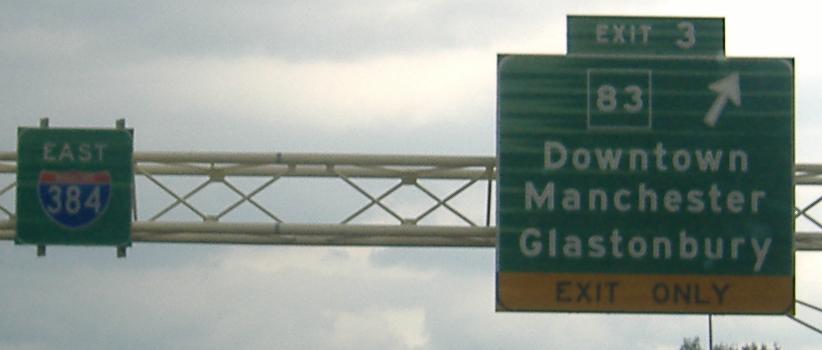 That's all of the eastbound signage; sorry for the blurriness, but a thunderstorm was looming and making lighting miserable. The photo called eend.jpg (i.e. the eastern end of I-384) says the expressway ends in half a mile. When US 6/44 join the freeway, I-384 officially ends, but that last half-mile of freeway would have become part of I-84.