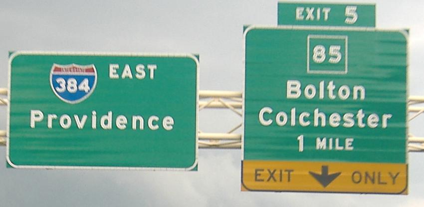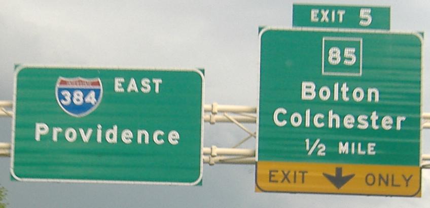 I-384 was meant to be I-84, extending east toward Providence. It's the largest of the three sections of freeway built; the other two are the Willimantic Bypass on US 6 and the US 6 freeway in Rhode Island. I-84 may also have used the end of the Connecticut Turnpike, which is now numbered secret CT 695. Once it became clear I-84 wouldn't fly, it was switched with I-86 (current I-84 from I-384 into Massachusetts), and this became 384.