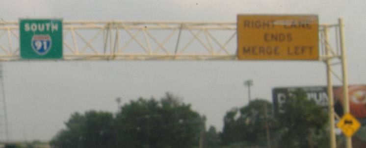 The last photo is at the merging CT 15 left-hand entrance ramp, which is taking traffic from I-84 WB to I-91 SB. Much of this traffic is going to NYC by following CT 15 to the Hutchinson River Parkway in New York, and will get off in 10 exits, as you will see below. (15/US 5 and 91 run parallel until then.)