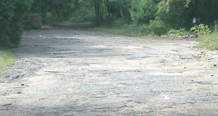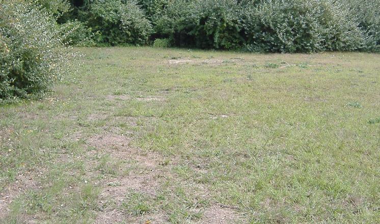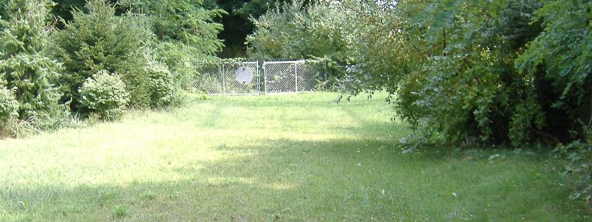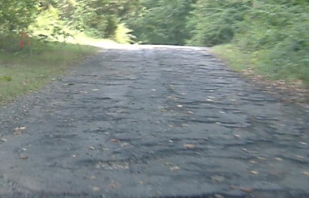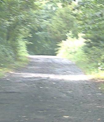 The second photo looks west from the same point at which the first photo looks east. As you can see, the pavement reappears after the patch of grass.