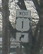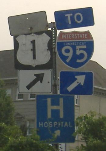 From the Connecticut Post Mall, off I-95 Exit 39, this new sign is hopefully only here for construction, since at least this half of US 1 was turned north-south a few years ago.
