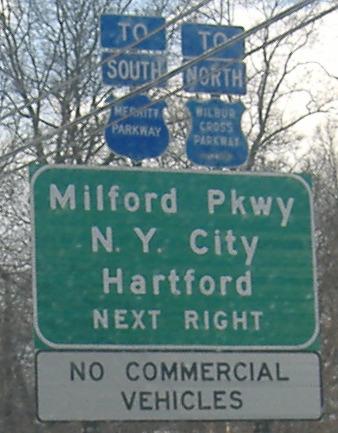 From US 1 SB, the very beginning of the Milford Parkway, as well as two cool shields for CT 15's Parkways. This could be the only mention of the Milford Pkwy. by name.
