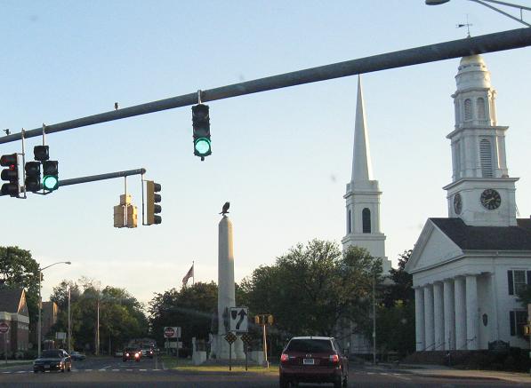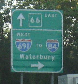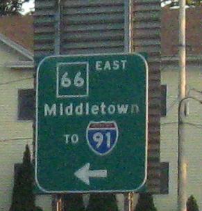 Southbound in Meriden. Photos 3-5, progressively closer views of the spire in the middle of US 5 (Broad St.), are at the actual CT 66 (Main St.); the first sign is for I-691 EB but that quickly ends at I-91 and then transitions into CT 66 EB.