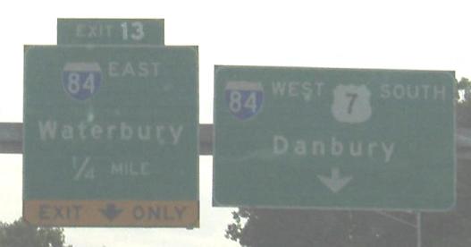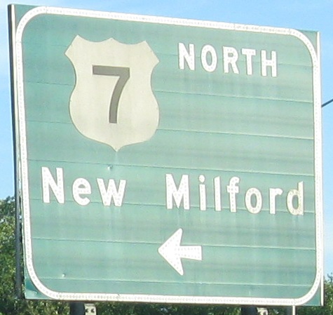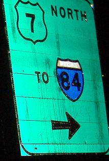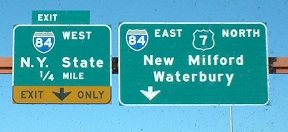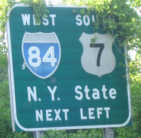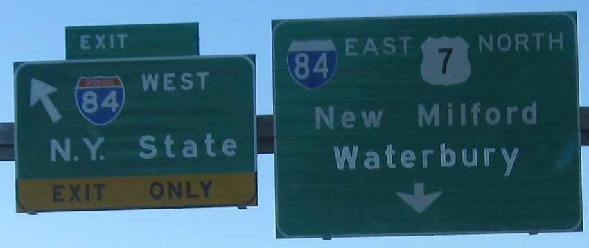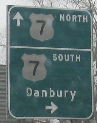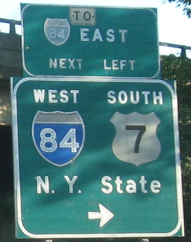 The original version of the US 7 NB signage, taken in 1969 by Michael Summa. Lake Ave. was left off of the BGS's, and US 7 was separated from I-84, perhaps to list more destinations, or perhaps to keep traffic on the left side of the multiplex. The destination missing on the left BGS was Newburgh - I assume it was taken off once I-84 was completed through New York.