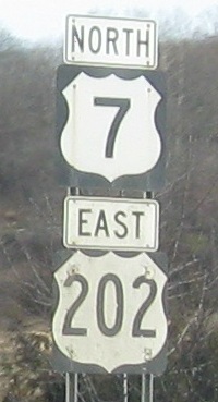 Continuing NB to the end of the third US 7 freeway section, which (unlike the other sections) had pavement stubs for the extension north of US 202 that remained unbuilt for decades. This discontinuous piece of freeway was numbered as if the freeway would be completed south to Norwalk, even though the piece south of I-84 (scroll up) was unnumbered or denumbered. First of all, Exit 11 (Federal Road) actually is where US 202 leaves the freeway, but that goes unmentioned. Second of all, Exit 11 actually leads to Candlewood Lake Road (or even White Turkey Road Extension), not Federal. Third of all, Exit 12 says TO US 202, when in fact it again goes directly to US 202. Was 202 on a different set of roads back in the 1970's? Fourth and finally, what no sign mentioned is that all US 7 traffic was forced off Exit 12 (graciously widened to two lanes so you couldn't tell what's going on), and then returned to a US 7/202 duplex (the two routes were together on I-84/US 6). However...
