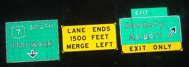 A complete account of northbound signage on the freeway, with blank exit tabs meant to hold numbers for the completed freeway. Judging from the Federal Rd. and US 202 exit numbers north of Danbury, these likely would have been 7-8-9. In the one daylight photo you see US 7's rust color for the gantry pole.