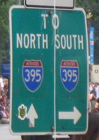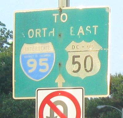Frankly, I'm flummoxed. These signs are still on 6th St., up to where US 50 leaves US 1 at NY Ave. Had I-395 been completed as I-95 north and out of the city, then "DISTRICT OF COLUMBIA I-95" would be just to the east of this intersection and the signs would make perfect sense. I can forgive the old sign under the premise that I-395 was still I-95 and planned to be completed back when DC would have used the full district name in the shield, but I can't forgive the new sign at all. Please don't excuse this as pointing to the Beltway or the B-W Parkway to get to I-95 from the city, since there is already a north-south route to get to I-95 in US 29.