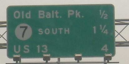 Eastbound. Why isn't DE 7 signed to also go north of here, and why is there no US 13 shield?