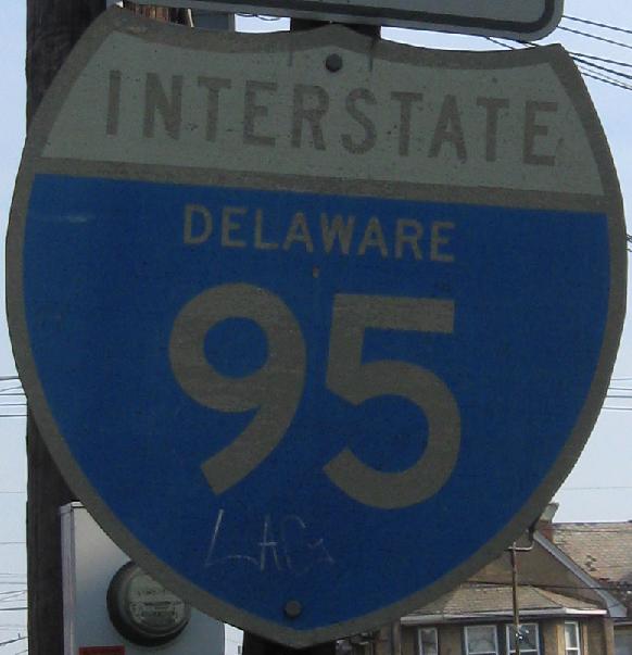 Somewhat older, this is an original 1963 shield to I-95 through Wilmington. It is found at DE 2, and if you have read that page anytime recently, this is the hint I refer to. Let's just say old signs rarely occur alone. Click for a closeup without any image adjustment (these were taken into the sun, but one came out better).