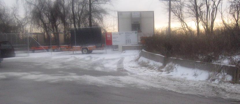 In 2009, there was a construction office on the old bridge stub for a project on the current Summit Bridge. The stub on this end is slightly more visible than the southern one, although trees and power lines obscure them both from the respective other sides. Now this one is framed by construction barriers, so it's hard to see what it looks like normally.