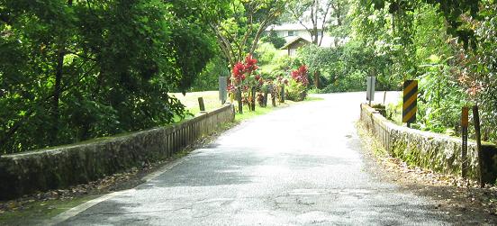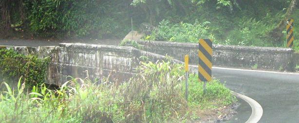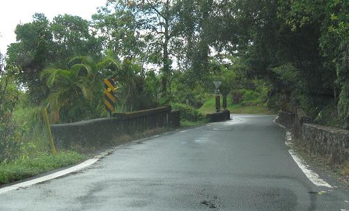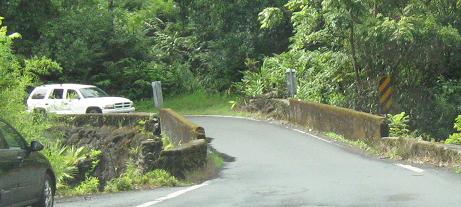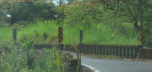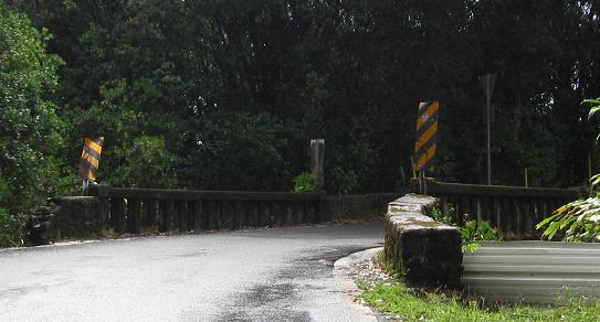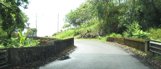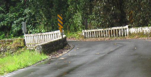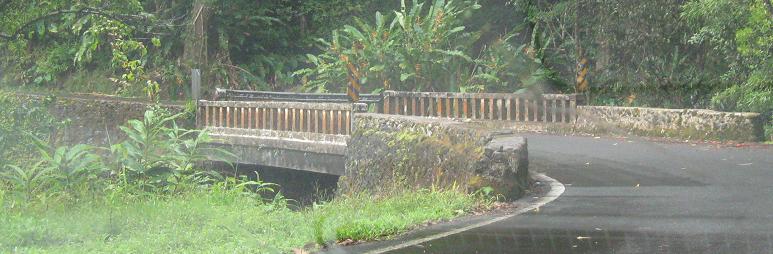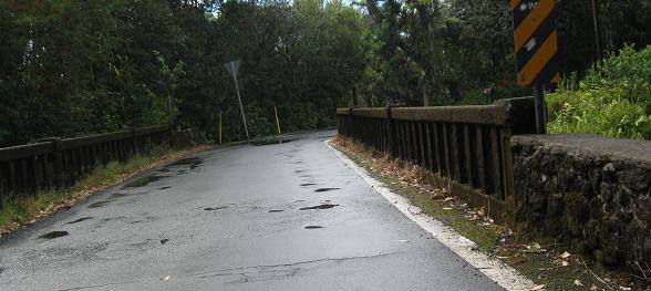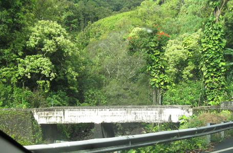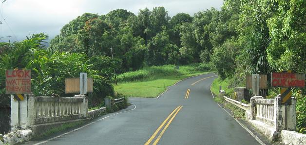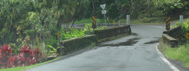 The third photo gives you a chance to be the bridge from the second photo. The last bridge opens into the outskirts of Hana - there's no formal beginning or end of settlement; the houses just start appearing and suddenly there's a town, and then the houses stop appearing again.
