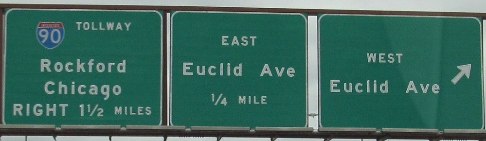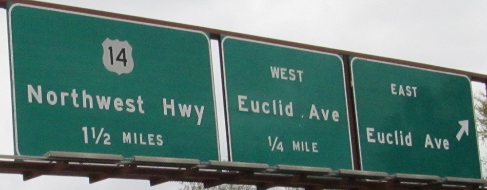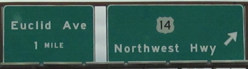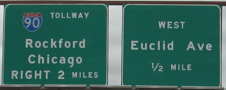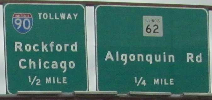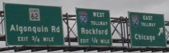 First and fourth photos are courtesy Doug Kerr. IDOT has a policy of signs next to each other being the same height, which has the primary appearance of wasting a lot of space, especially when both signs are stretched just to fit a taller gantry.