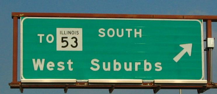Lake Cook Road, with a crowded TO and an interesting destination, courtesy Scott Colbert. While IL 53, and its continuation of I-290 and I-355, does serve the western suburbs, some of them have names, too. Now, there are just generic "SOUTH 53" signs in either direction. Someone read my site.