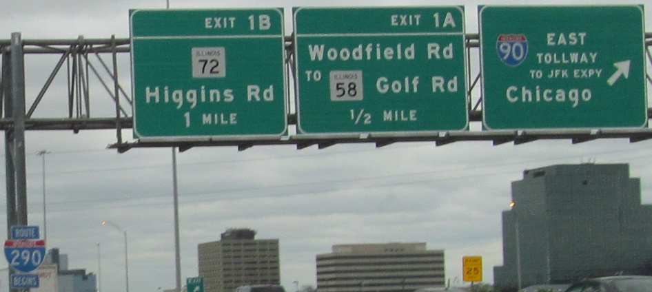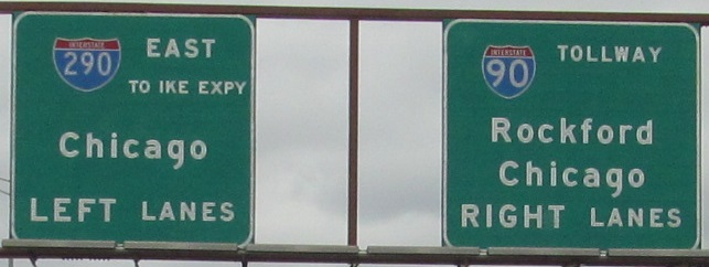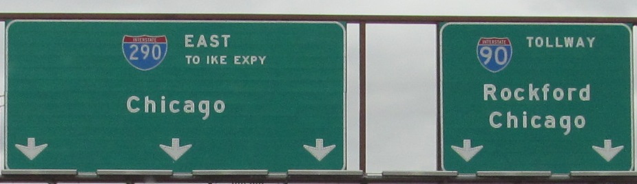 There's no mention that IL 53 continues along I-290 and the "Ike Expy." The green signs are all over the IL 53 SB/I-290 EB C-D road through this raft of interchanges. I trimmed the last photo to keep "Route 290" in the picture, just because the top banner is so unnecessary. "IKE" and JFK" will get you blank stares if you use them around Chicago; go for the full last names.