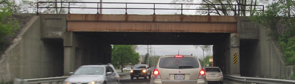 Four lanes barely squeeze under this railroad overpass in Lisle, constraining the roadway that widens out on either side.