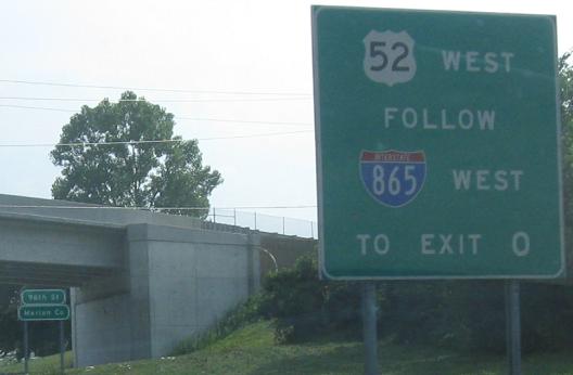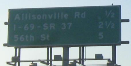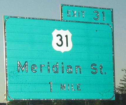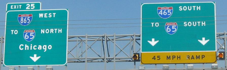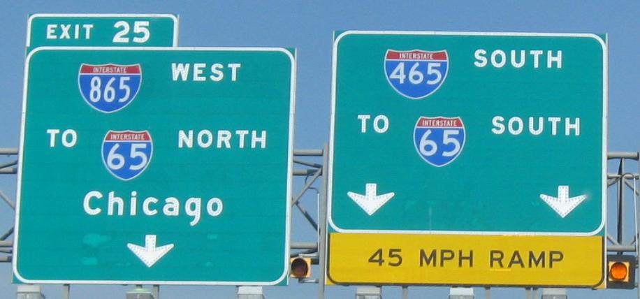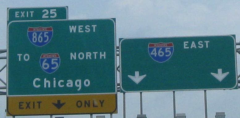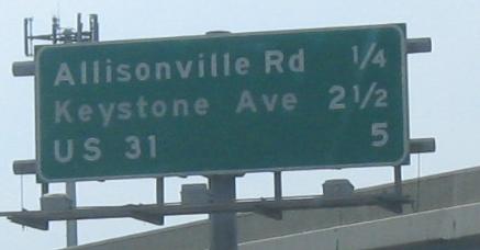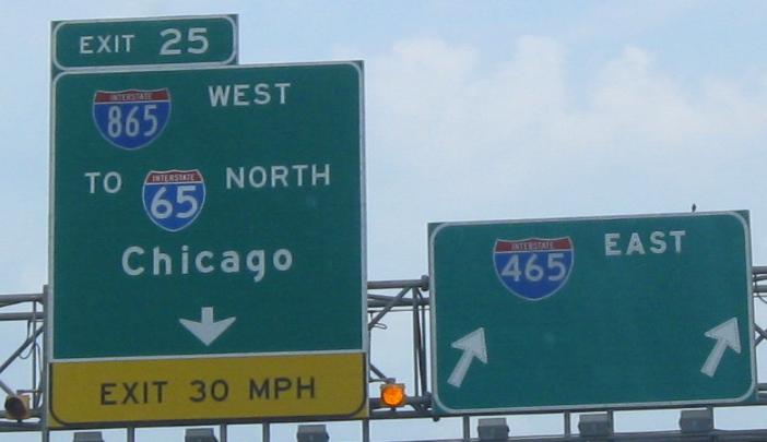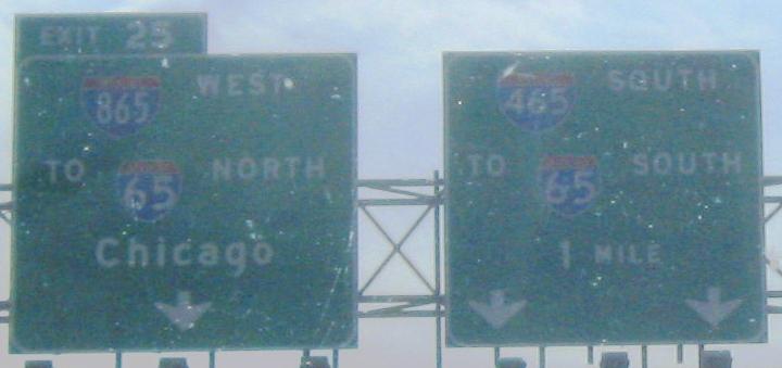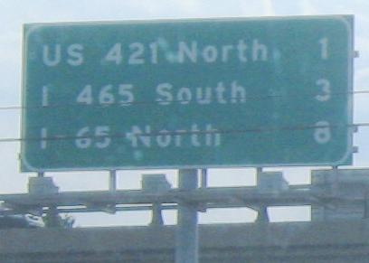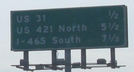 Ending with a couple of non-button copy signs. US 31 disappears at Exit 31, marking two routes in six miles that exit at the right number. Most routes can't manage one. Note that I-465 is signed as exiting from itself, which it does, although it used to spawn I-465 Spur (sort of the same route) whereas now the straight-ahead highway is I-865, which comes to an inexplicable Exit 0. The only exits on I-865 are at I-65 and I-465, so it should not have exit numbers. Freeway signs should not use the font seen in the last photo. We move on.