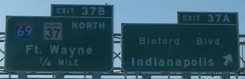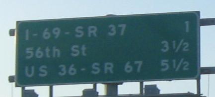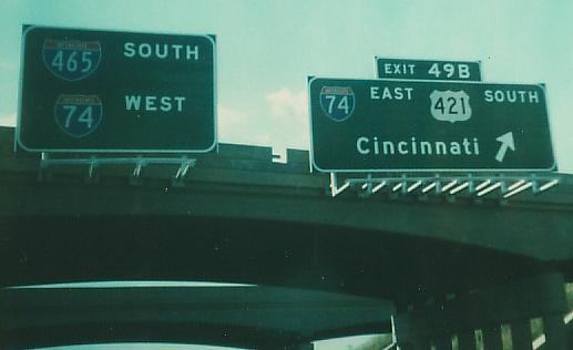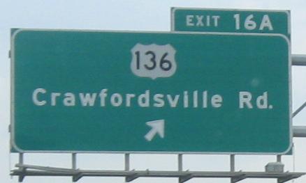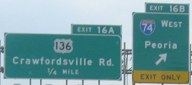 SB until the I-74 multiplex page takes over (see first link below). The little Lafayette Road shield is at Exit 21 in this direction. In the last two photos, Exit 16A should be for US 136 West, which begins heading eastward but quickly turns the right direction once out of the interchange.