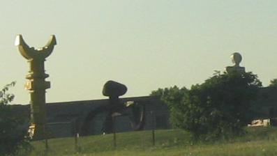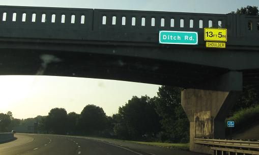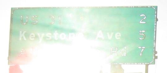 Eastbound into the sun, dipping back into Marion County (Indianapolis) as I head past plenty of button copy, strange off-highway sculptures, and one interesting bridge with an interesting (ugly) clearance sign. Keystone Ave. was SR 431 until 2007, hence the obvious state route shield omission from the advance signs and reflective patches on advance exit signs. Notice that Exits 31 and 37 are for the identically numbered routes. This is likely coincidence, because the beltway's exit numbers start at I-65 in the south like the FHWA intended, but it's still a head-scratcher. Exit 37A used to be for IN 37 South, but not too long ago (and probably close to when it happened to US 31), SR 37 was pulled out of the city and strung along the beltway. In this eastbound stretch, three new routes join the party: US 421, US 31, and here SR 37.