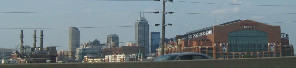 Continuing into Indy. Even overpass signs are button copy - and many states don't have those at all. The median exit approach signs are normally only seen in California. The last photo is where the Indianapolis Colts now play, with downtown in the background.