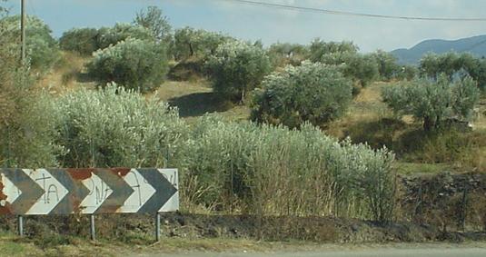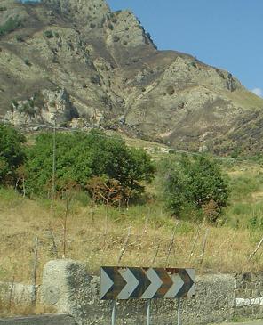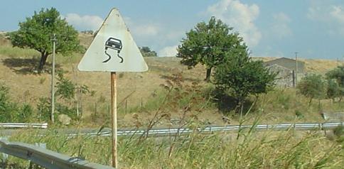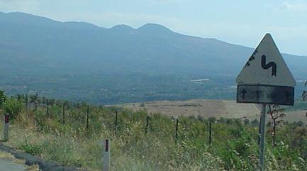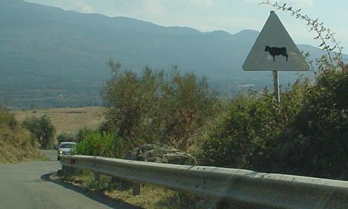 Old warning signs for curves and cows, with an old chevron plate thrown in. Whenever the road curves to the south (photos 1, 3, and 5), Mount Etna rises in the background, hopefully silently.