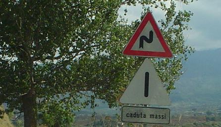 Heading east into Moio Alcantara. Caduta massi means "falling masses", and may be a sign that predates the standard falling-rock graphic. Alberi in banchina means "trees in dock", or unprotected trees near the side of the road that may come out and try to eat you. From here, Lou continued east on SP 1 toward Ponte San Paolo, so follow the ride below.