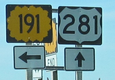 US 281 NB and K-191 EB at their intersection, the only road of consequence K-191 intersects. K-191 isn't here to link anything together. It only serves one purpose of questionable importance. The reason I have so many K-191 shields on this page is that the digits are crammed so close together in an unnecessarily narrow font.