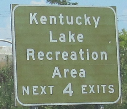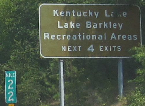 Hold the presses, did Kentucky misspell Kentucky? That's all I can imagine at Exit 45, but H.B. Elkins explains that it was likely "Eddyville" that was greened out. Farther east is just another older brown sign for the lakes.