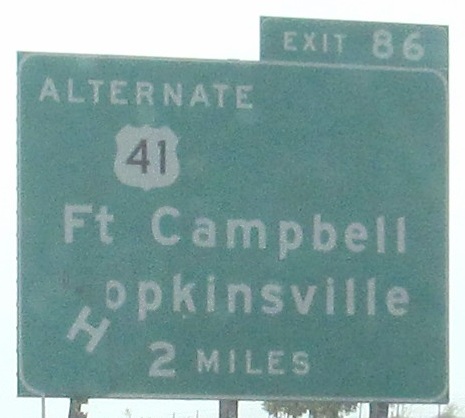 Who is Ky Dam, and why is he on a sign? Even if it were done correctly, why would Kentucky Dam be a destination? Cadiz, Hopkinsville, even Land Between the Lakes (not that anyone would want to spell that whole thing out)? The second sign is at the bottom of the EB Exit 4 ramp.