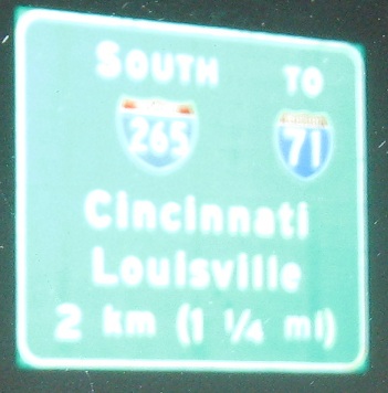 More metric units as I turn around and head clockwise around the loop. Exit numbers appear once I'm on I-265 (i.e. once I pass I-64), but there's still random metric there. The Exit 14 sign is as old as you'll find in Kentucky, which isn't old enough.