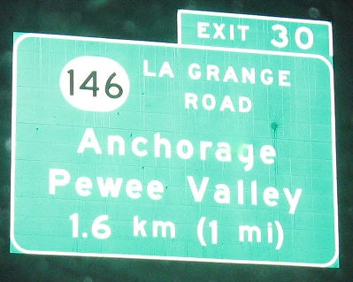 KY 841 WB from I-64, as opposed to the KY 841 that heads WB from I-65. That's because KY 841 is the part of Louisville's outer beltway that has been constructed. Between I-64 and I-65, it also has the I-265 designation. There's an I-265 in Indiana as well, connecting the same two Interstates on that side of the river, and the obvious plan is to connect the like-numbered routes. KY 841 is thus a placeholder number until at least one of the crossings is built (the one by this sign, since there are two stubs and a short distance between them). I like this stub because it has metric units on it in a place not near any border, in a state with no other known tendencies to post in kilometers.