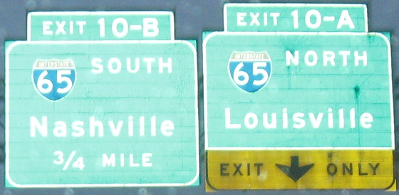 The clockwise WB as I-265 ends again and becomes just KY 841 (as you saw on top, 841 never disappears). Usually, the direction that counts up in exit numbers would also count up in letters, so having B after A in the WB direction is a surprise. However, the way the EB Exit 10 ramp splits, the ramp to I-65 NB is on the left, which would put "A" to the left of "B" if they were lettered. So it's okay.