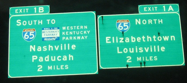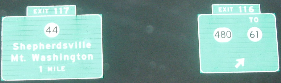 Older NB signs. Kentucky doesn't have button copy, so centered exit tabs and background wear are quick clues. Also notice that the exit tab borders are squared, whereas on newer signs (see Blue Grass Pkwy. above), they get rounded.