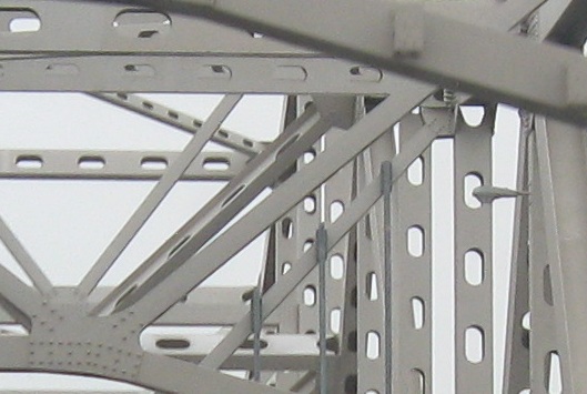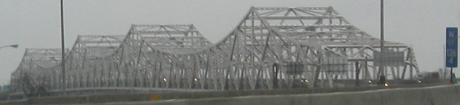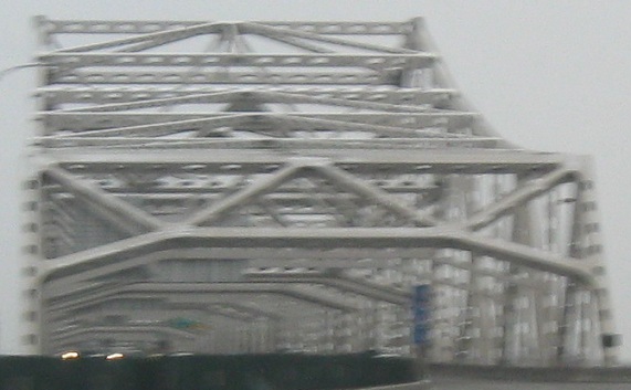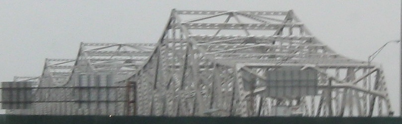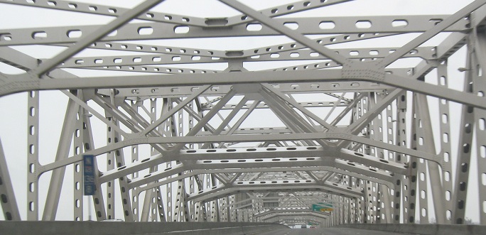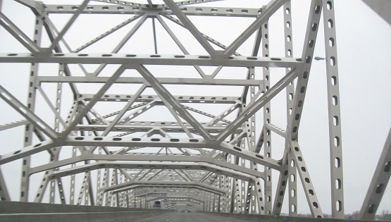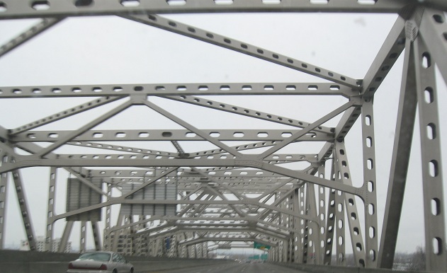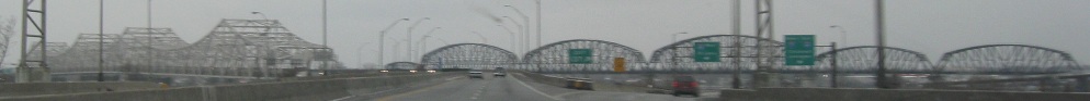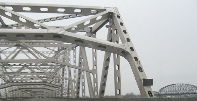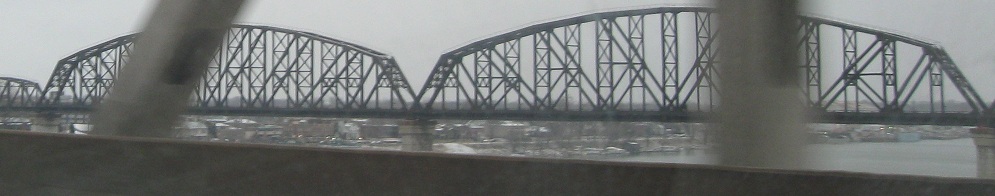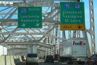 NB across the Ohio River and into Indiana on the JFK Bridge. To the east is the Big Four Bridge, a former railroad bridge soon to become a pedestrian walkway.