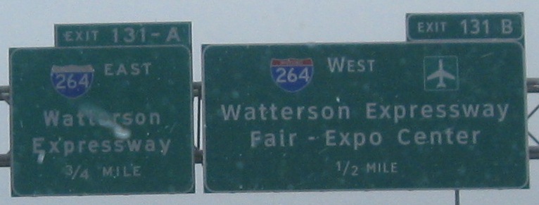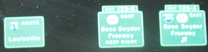 NB at I-265, showing Kentucky's classic practice of hyphenated exit letters that may (hopefully) be disappearing. My caption demonstrates that KY 841 is the same as I-265. In fact, if I-265 is ever completed as a full Louisville beltway, there will be no KY 841. However, the eastern Ohio River crossing to Indiana is a lot closer to realization than any hypothetical western one, so the likely scenario is that KY 841 would be truncated to I-65 (because there's no more eastern stub for it to get to) and the rest of the highway would be just plain I-265.
