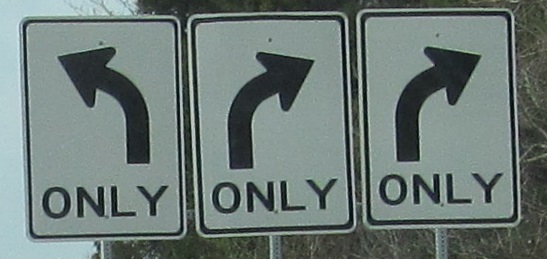 SB on the same bridge, courtesy Doug Kerr. If the sign on the left were installed just a little bit farther to the right, there would be no need to tilt the arrows. Also, the sign on the right has plenty of room to follow the MUTCD and read "EXIT ↓ ONLY."