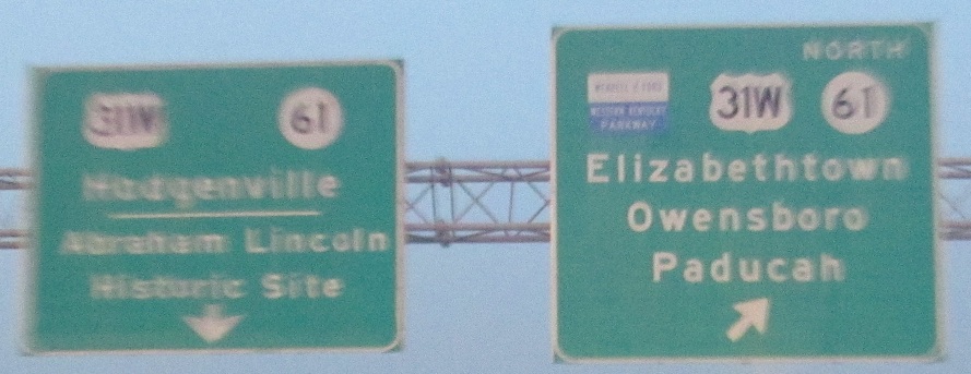 The SB Exit 91 ramp to the beginning of the Western Kentucky Pkwy. It's an unusual cloverleaf, with a separate ramp to KY 61 NB coming off of the ramp to the Parkway. To make the signs make sense, both shields on the left should be "SOUTH" and the "NORTH" should be centered over the US 31W and KY 61 shields on the right.