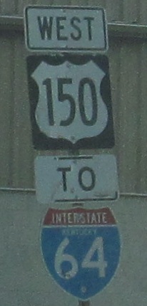 US 150 doesn't leave US 31E until Louisville, and then has a brief dalliance with US 31W across town before breaking free on its own once more - that is, until it has to borrow I-64 for a ride across the Ohio River. Cue the narrow US shield and state-name Interstate shield.