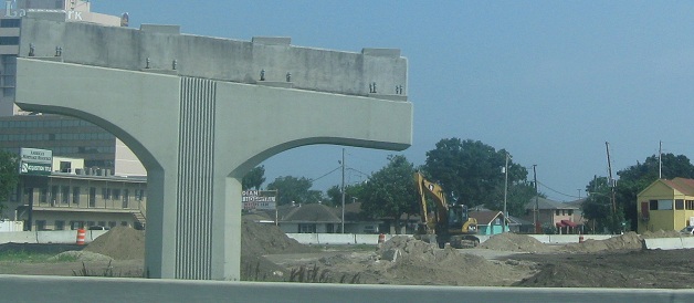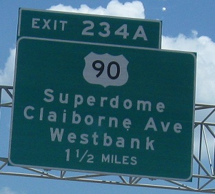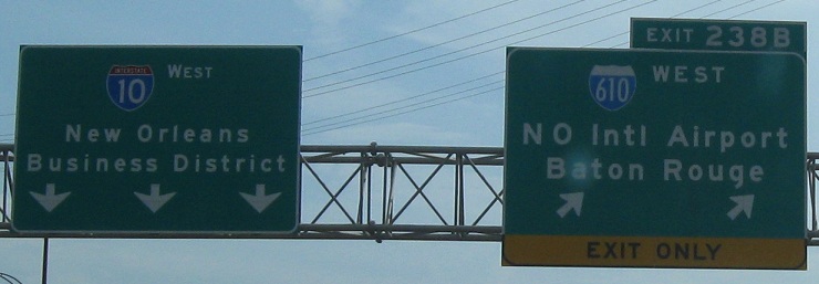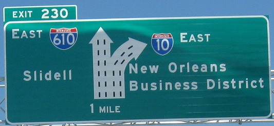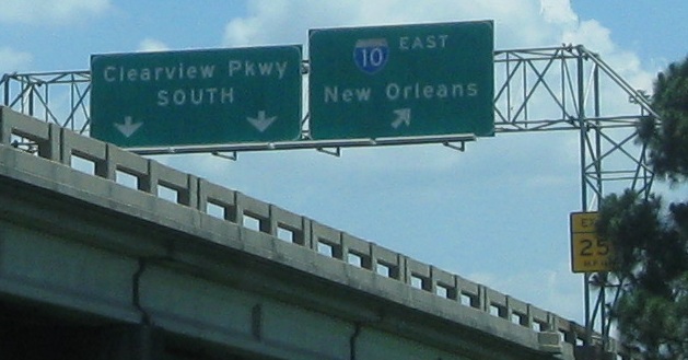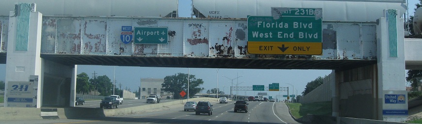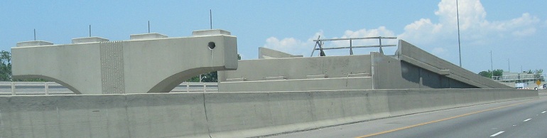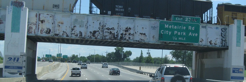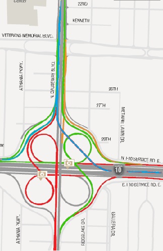 ![]() | I-10 EB to either direction of Causeway Blvd. remains a normal loop. I-10 WB to Causeway SB is a normal loop (shown in red). I-10 WB to Causeway NB, in green, flies over the Causeway NB ramp to Veterans Blvd. (in orange), and there's a separate ramp (also in orange) to get I-10 WB traffic to Veterans. Causeway NB to I-10 EB is a normal ramp, and to I-10 WB is a variation on a typical loop ramp. By leaving the roadway south of the first loop, it eliminates the weave of a typical cloverleaf, at the expense of a separate overpass of I-10 to get to the loop. Causeway SB to I-10 is shown in blue. It flies up between Causeway Blvd. and the ramp from Veterans, splitting into a normal ramp to I-10 WB and a long flyover into the center of I-10 EB. While left-side merges are discouraged, there's just not much else that can be done here, and traffic will be coming in at a high speed off a straight downgrade. Finally, Veterans to I-10 WB is shown in green - it comes up next to the Causeway SB ramp and splits to the right, and Veterans to I-10 EB is shown in red - it crosses under the Causeway SB-I-10 WB ramp and does the same modified loop as the NB-WB ramp. It apparently was just too complex to combine the Causeway and Veterans ramps to I-10 WB into a single entity. Not shown here is Veterans to Causeway SB, which I assume is a slip ramp underneath the blue Causeway SB ramp. So, back to the photos. The first few photos show the Causeway SB-10 EB ramp touching down in the median. In the first photo, the blue ramp flying overhead is the Causeway NB-10 WB loop ramp (as I said, requires a separate overpass). In the fifth photo, as the center ramp merges in, there's a new ramp on the WB side taking Bonnabel Blvd. and frontage road traffic onto I-10. It's braided (I just defined it in my definitions, so read up) with the 10 WB Exit 226 ramp to Causeway due to the traffic volumes from 10 to Causeway. |