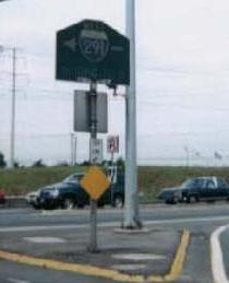 Really old signs on the Exit 6 offramp. The first, courtesy Doug Kerr, dates from the construction of I-291 - with the cut corners, it must be the early 1960's (the two-digit shield and the arrow through it are other clues). The second still stands across from the end of the ramp. That's all button copy, and it's likely just as old as the LGS.