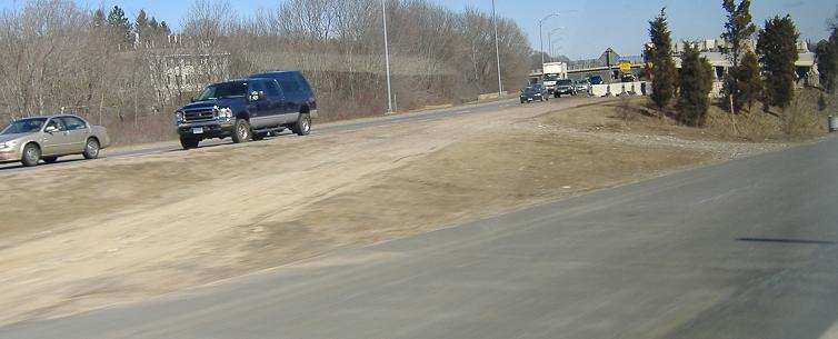 The above sign is on the overpass that carries traffic to Exit 14, and in the daytime, this is what you'd see to the left. Those Jersey barriers are being stored on the original eastbound lanes of I-90, which are of course just a few feet south of the original westbound lanes, now the onramp from Exit 14 (I-95, MA 30).