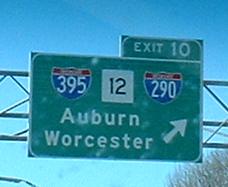 Still looking westbound, and then buton-copy shields peculiar to MA on the EB/WB exit ramp. I-395 and I-290 turn into each other directly underneath the Pike (see link below to I-290 folder for more detail). I don't get why I-290 is in B (narrow) font for all Exit 10 signs, while I-395 gets standard C font.