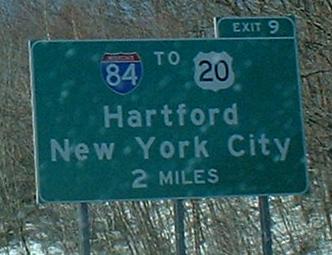 Heading WB, I-84 gets extra-special treatment with a 2-mile warning sign because so much traffic splits off to use it. Notice that New York City is used as a control city, even though you have to take a minimum of two other roads to get there (unless you simply follow the Wilbur Cross Highway into CT 15, all the way into the Hutchinson River Parkway, but that's not a very good route).