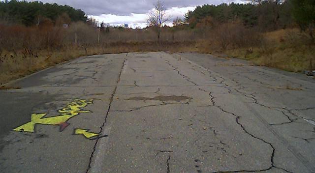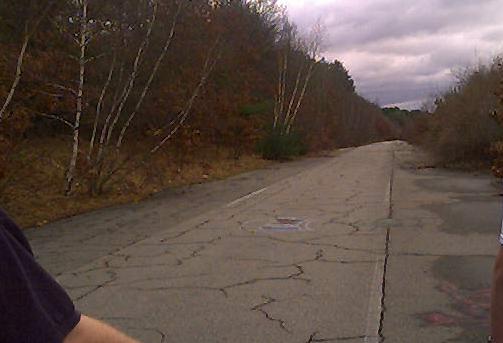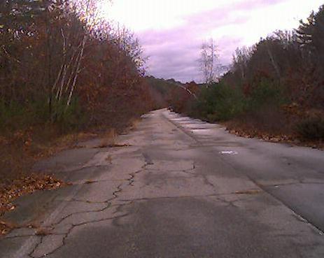 Two views from the southern end of the freeway section, facing northward. The second one is off of Hale Rd., and you can see bright shiny stripes. Until some relatively recent point in time (early-mid '90's?), MassHighway used the southern section of abandoned I-95 for stripe testing; you can tell it's not currently in use because the wild grass is slowly overgrowing the newly painted left yellow stripe.