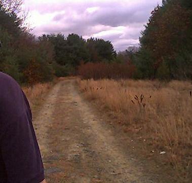 Starting with the NB-EB movement, walking southward from MA 113 along the original Exit 57 down to the original roadway. As you can see, there are traces of ramp pavement here even though MassHighway took care to tear this portion up. But beyond the fence is still their property.
