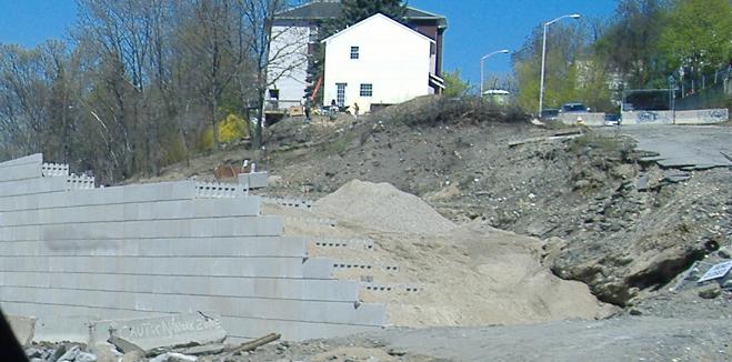 Looking back north, while traveling southbound, at a new retaining wall for the completion of the MA 146 freeway to I-290.