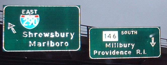 Signage dating from the completion of I-290, at the very beginning of MA 146, and while the first (southbound) one is gone now, the second (northbound) one was still there as of May 2007. The 290/146 interchange was a traffic circle until construction started.