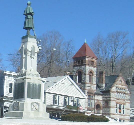 NB in downtown Warren to meet MA 67 at the Civil War statue, featuring the battles of Yorksburg and Antietam.