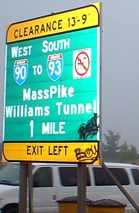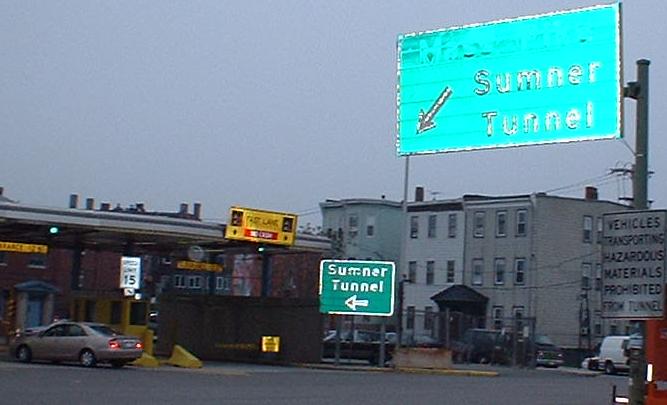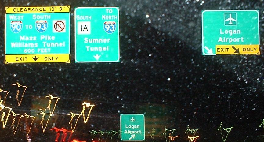 The first sign coming out of the Callahan Tunnel NB. Click before it to watch a video through the tunnel.