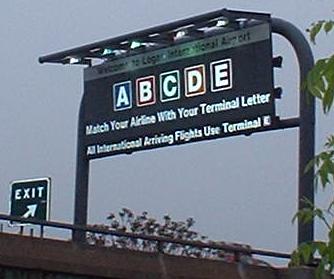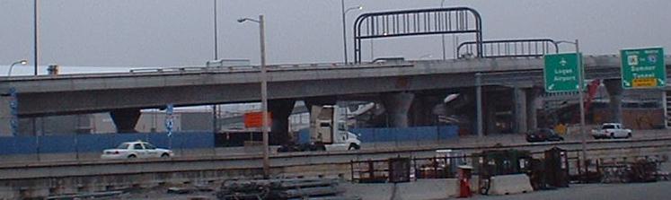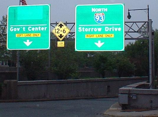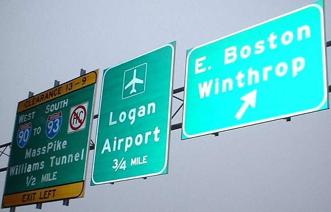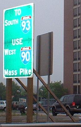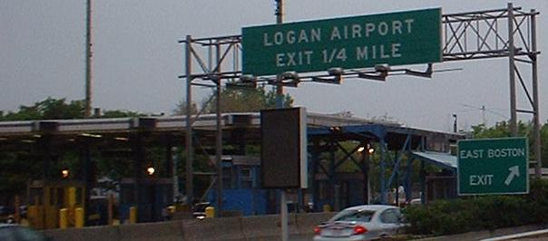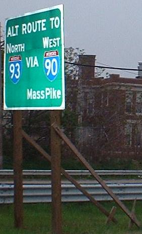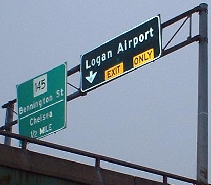 SB at the Logan exit, which is several hundred feet north of the NB exit (forming an extended and complicated 3-Y). Alternate routes to I-93 and I-90 are signed down the airport road, which I'm sure stems from construction of 90 through airport property, but just might remain there for the truly clueless motorists who missed the numerous advance signs for I-90.
