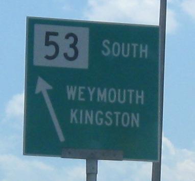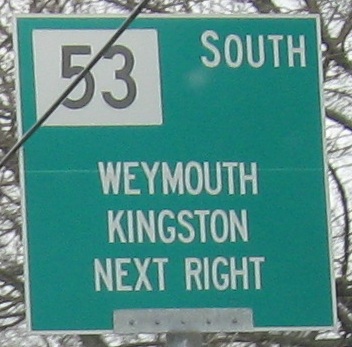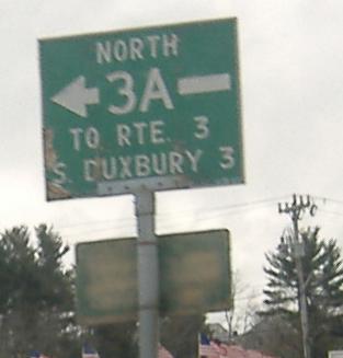 SB at the southern end, but I believe this old sign is gone now with its message of 3 miles to Rte. MA 53 starts and ends at MA 3A and is actually a shortcut for the route. I believe that this was original MA 3, and it's entirely possible that 3A between the two ends was always 3A (whereas the rest of it had originally been 3). Otherwise, this became 53 when the coastal route was constructed.